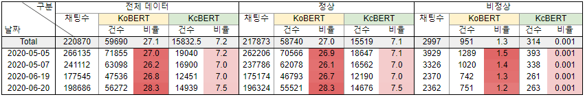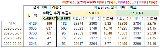 그림 7. 모델별 비매너 채팅 탐지 결과