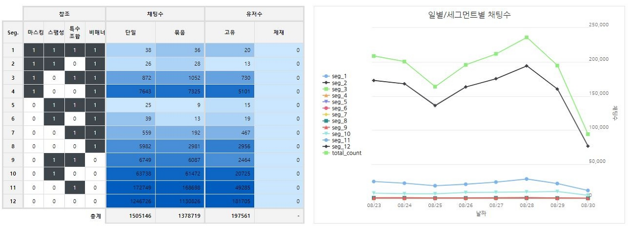 우리는 데이터 특성과 이슈들을 종합하여 세그먼트 분류를 제시하였습니다. 비매너 패턴 유무를 포괄하여 마스킹, 스팸, 특수 조합의 총 4가지 특이 패턴을 정의하였고 총 12가지의 세그먼트를 도출하여 채팅을 세분화하였습니다.