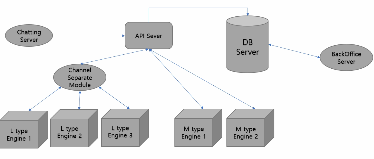 그렇다면 게임 내에서 어떤 방법으로 처리를 하여야만 유동적이고, 데이터를 적절히 분배하여 처리를 할 수 있을까 생각한 결과 결론은 ‘채널’이었습니다. 게임은 각각의 채팅 채널을 운용하고 있습니다. 또한 특정 채널에 유저가 몰려 채팅을 진행하는 특성이 있어 채널별로 채팅을 분리하여 엔진에 처리를 하게 되면 게임별 데이터 사이즈에 상관없이 처리가 가능할 것으로 예상하였습니다.