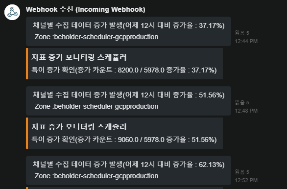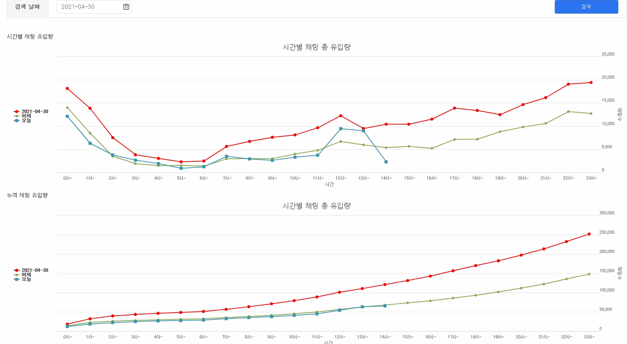 우리는 그림 6에서 확인할 수 있는 것처럼 매일 각 시간별의 지표와 합산 수치를 수집하였습니다. 또한 그림 7에서 확인할 수 있는 것처럼 동시간 대비 30% 이상의 데이터 증가율이 나타나거나, 합산 수치가 동시간 대비 30% 이상의 증가율이 나타날 경우 채널 분리를 진행하여 부하를 분산처리하였습니다. 그 후 어떤 채널을 분리하여야 하는지, 어떤 방식으로 채널을 분리할지에 대한 방법을 생각해봐야 했습니다.