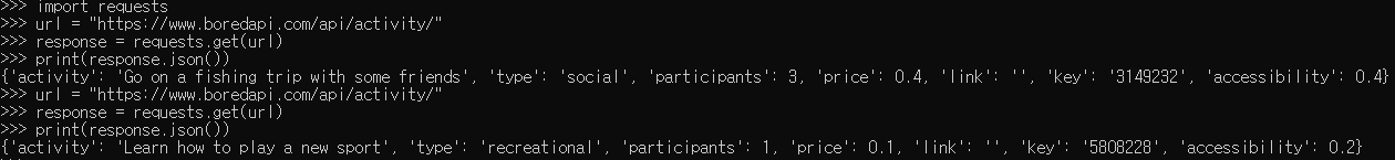 마지막으로 Bored API 가 있습니다. 간단히 말해서 이 재미있는 API의 목적은 지루할 때 할 수 있는 활동을 제안한다.