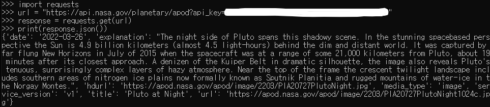 API 키를 발급받은 후에 천문학 사진을 요청해보았다.