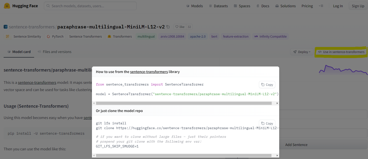 원하는 모델을 찾아서 들어가면 하기 이미지에 노란색 버튼 </> Use in sentence-transformers을 눌러주면 model repo를 clone 할 수 있는 명령어를 복사하여 CLI에서 입력을 해주면 모델이 다운로드된다.