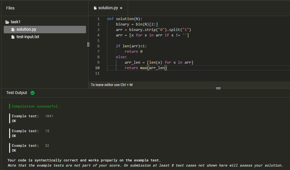 For example, number 9 has binary representation 1001 and contains a binary gap of length 2. The number 529 has binary representation 1000010001 and contains two binary gaps: one of length 4 and one of length 3. The number 20 has binary representation 10100 and contains one binary gap of length 1. The number 15 has binary representation 1111 and has no binary gaps. The number 32 has binary representation 100000 and has no binary gaps.