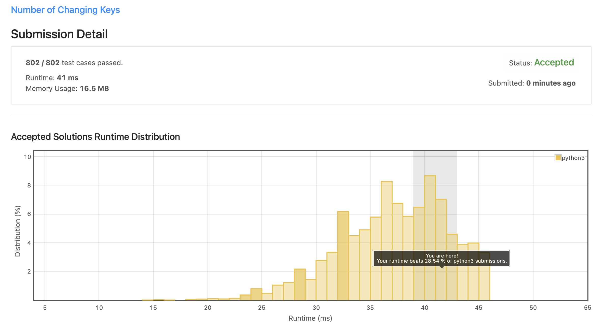 Can you solve this real interview question? Number of Changing Keys - You are given a 0-indexed string s typed by a user. Changing a key is defined as using a key different from the last used key. For example, s = "ab" has a change of a key while s = "bBBb