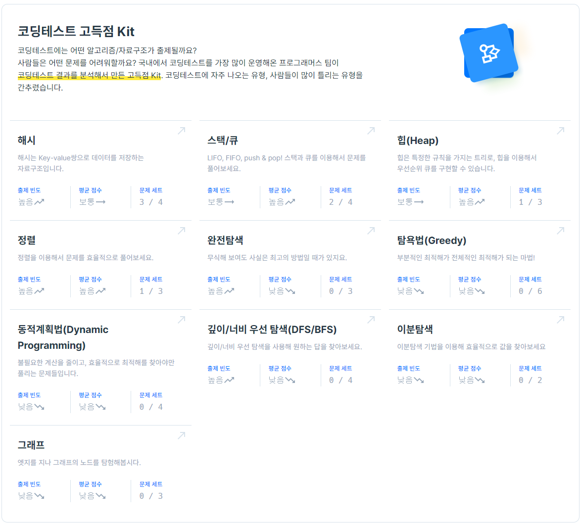 문제는 각 알고리즘/자료구조 별로 나누어져 있는데 코딩테스트에 가장 많이 나오는 유형들로 구성되어있다.