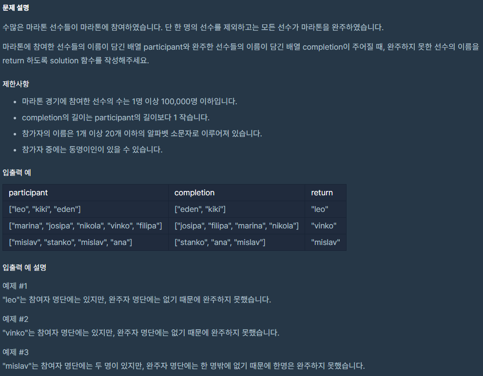 문제 링크 : https://programmers.co.kr/learn/courses/30/lessons/42576