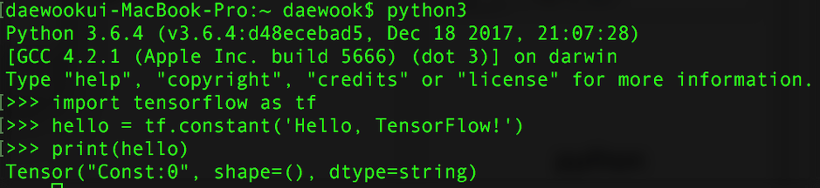 출력결과 = hello는 텐서플로의 Tensor라는 자료형이고, 상수를 담고 있음을 의미하는것이다. dtype = stinrg, float , int, etc.