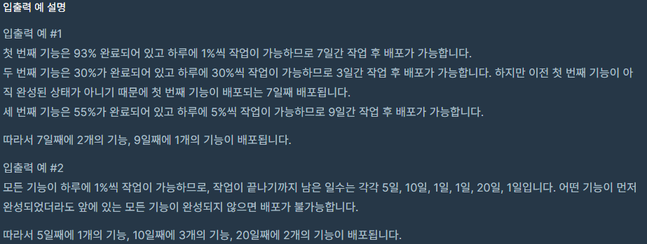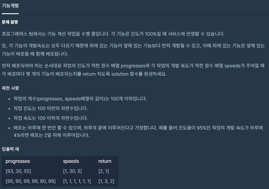 프로그래머스 팀에서는 기능 개선 작업을 수행 중입니다. 각 기능은 진도가 100%일 때 서비스에 반영할 수 있습니다. 또, 각 기능의 개발속도는 모두 다르기 때문에 뒤에 있는 기능이 앞에 있는