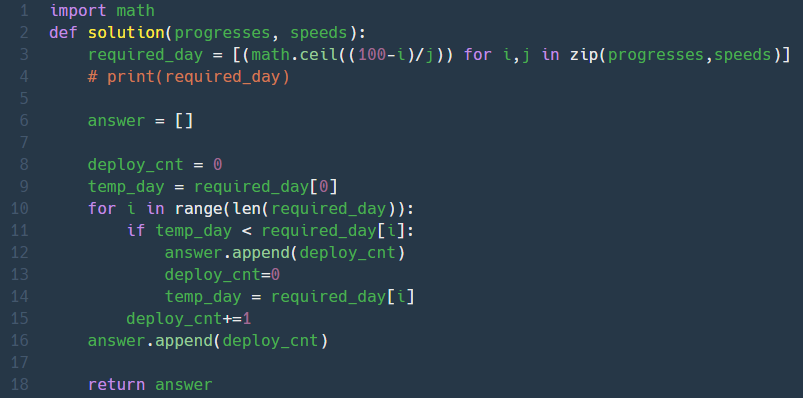 2. required_day 리스트를 한 줄로 만들어주었다. zip으로 묶어서 각 리스트의 값을 받아오고, 100-i가 잔여 작업, j가 속도로써 두 개를 나눠서 올림해주었다.