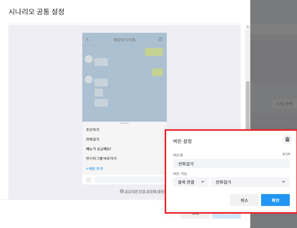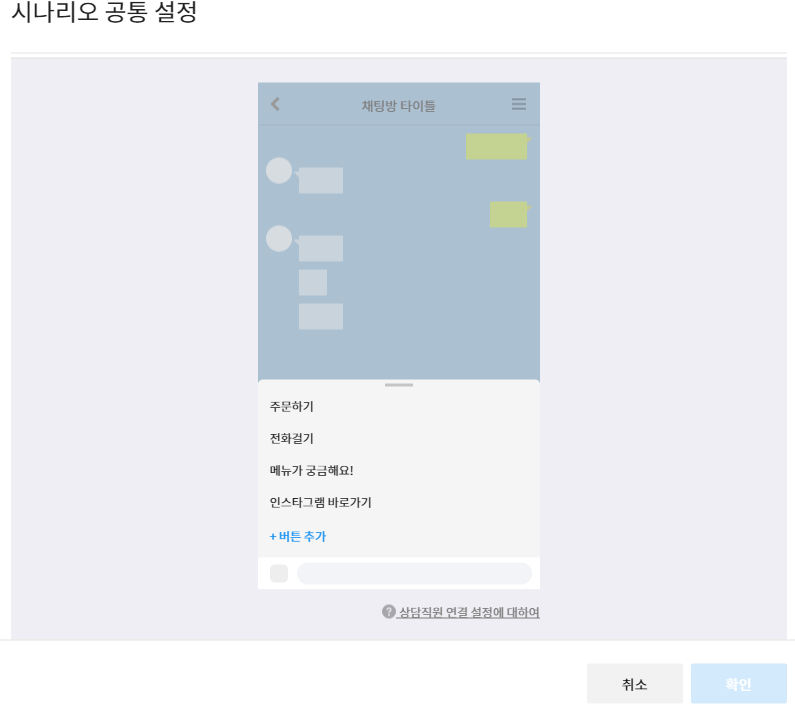 이렇게 버튼을 4개를 추가했다. 가게 챗봇이기 때문에 주문, 전화, 메뉴, 인스타그램 바로가기를 설정했다.