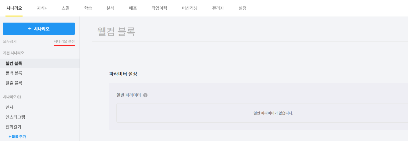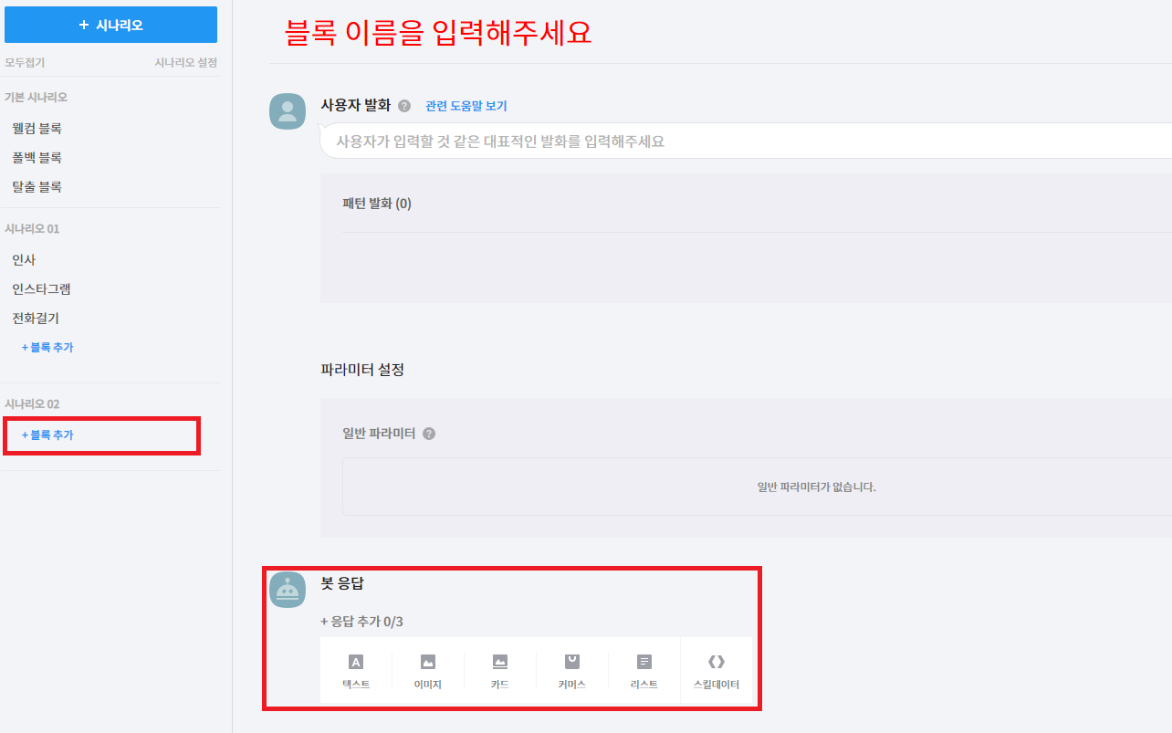 왼쪽 사이드바에 빨간색으로 표시된 블록 추가 버튼을 누르게 되면 시나리오를 생성할 수 있다.