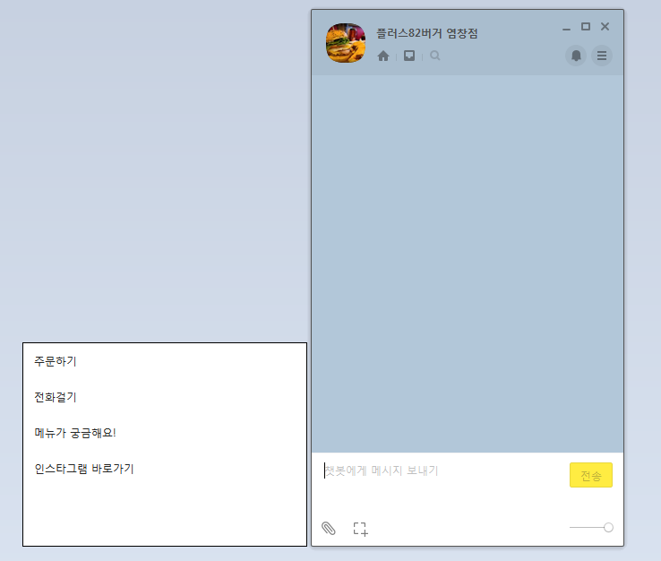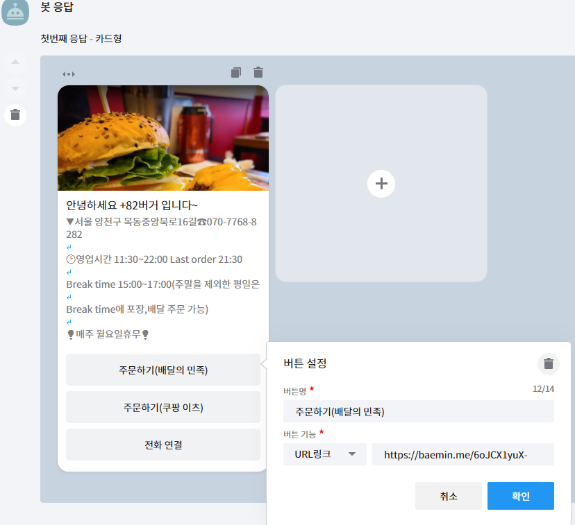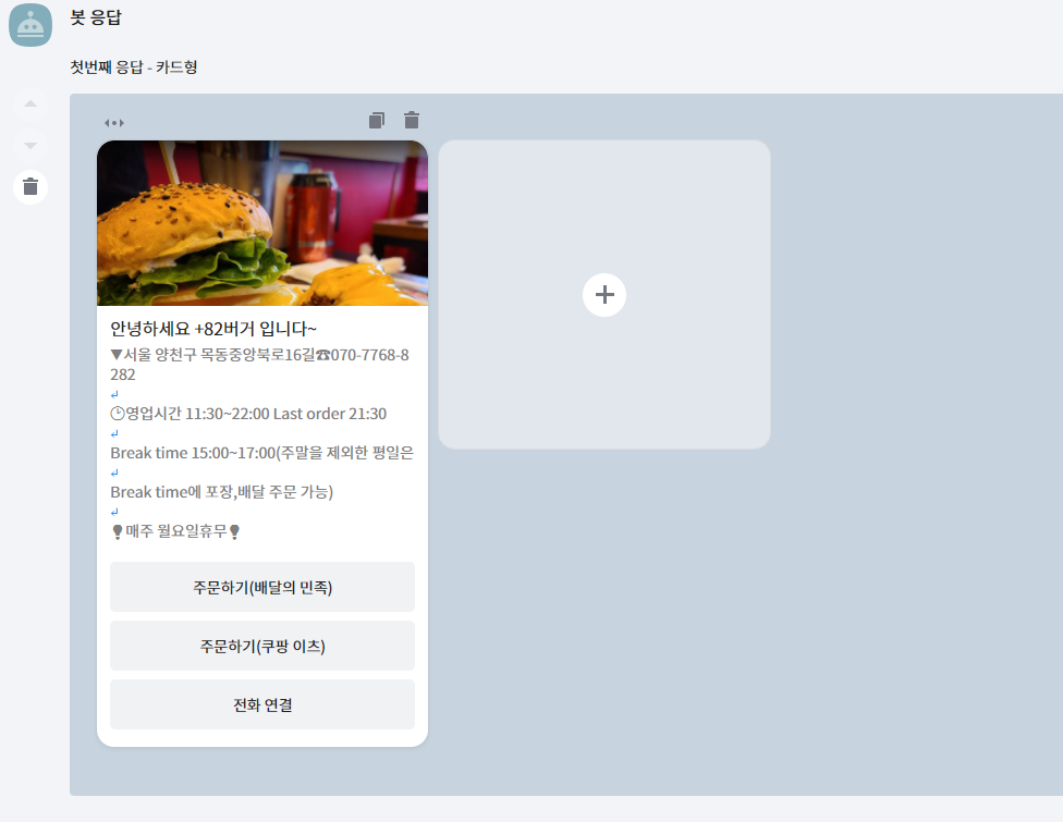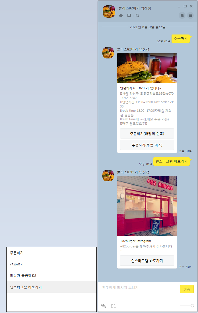 플러스82버거 카카오톡 챗봇 연결 링크 - https://pf.kakao.com/_xhRRms