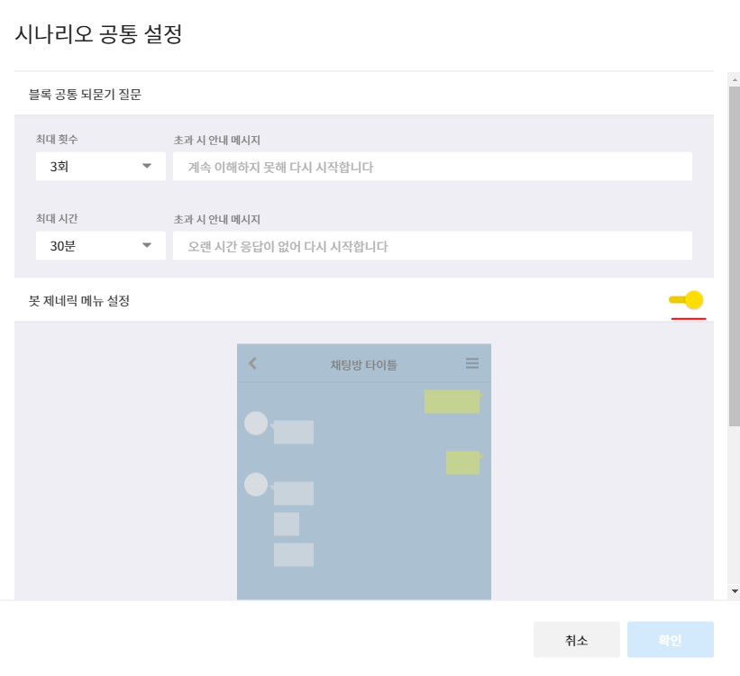 해당 모달창이 나오게되면 봇 제네릭 메뉴 설정은 활성화 시켜준다.