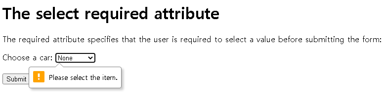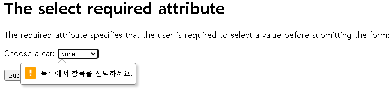 이 때 select 콤보박스는 required 옵션이 있어서 값이 없는 경우에는 알림이 뜬다.