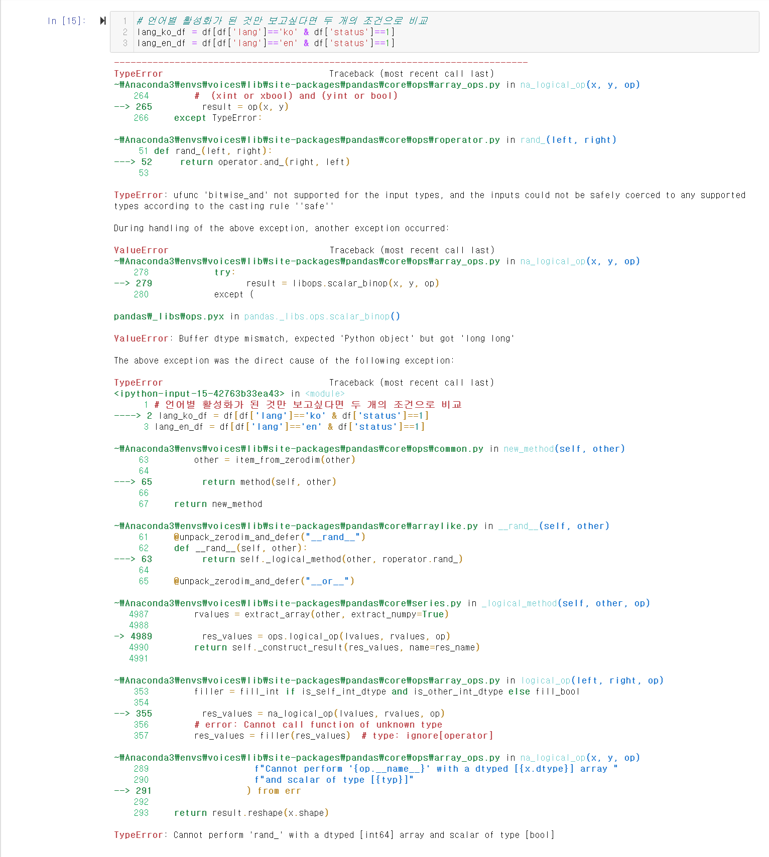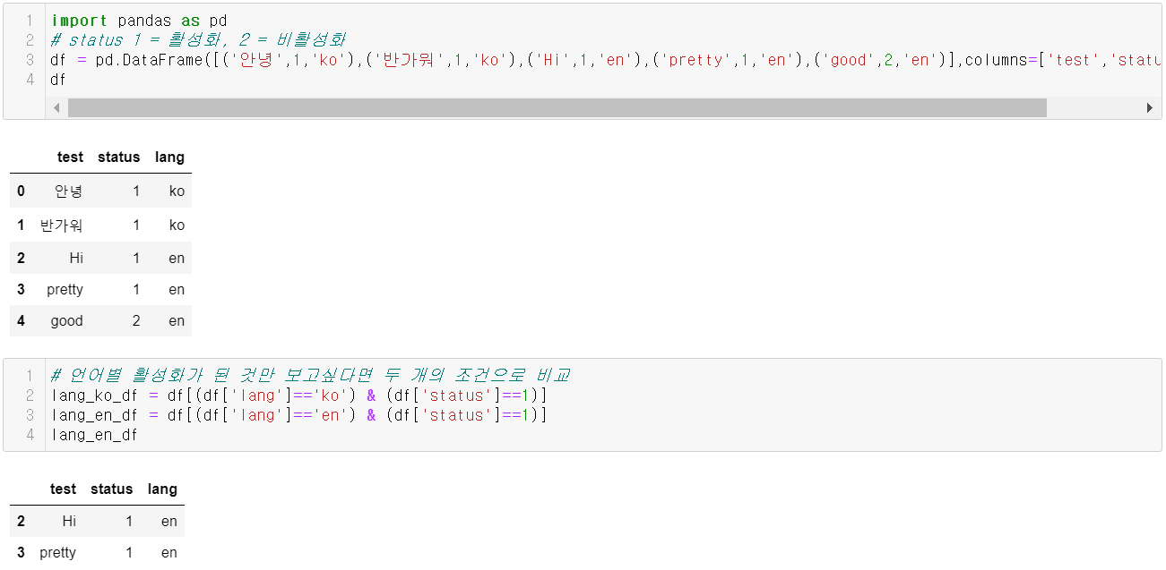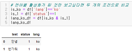 status와 lang 컬럼을 기준으로 두 가지의 조건을 만족하는 행만 추출하고 싶을 때 조건을 적어주는 방법이다.